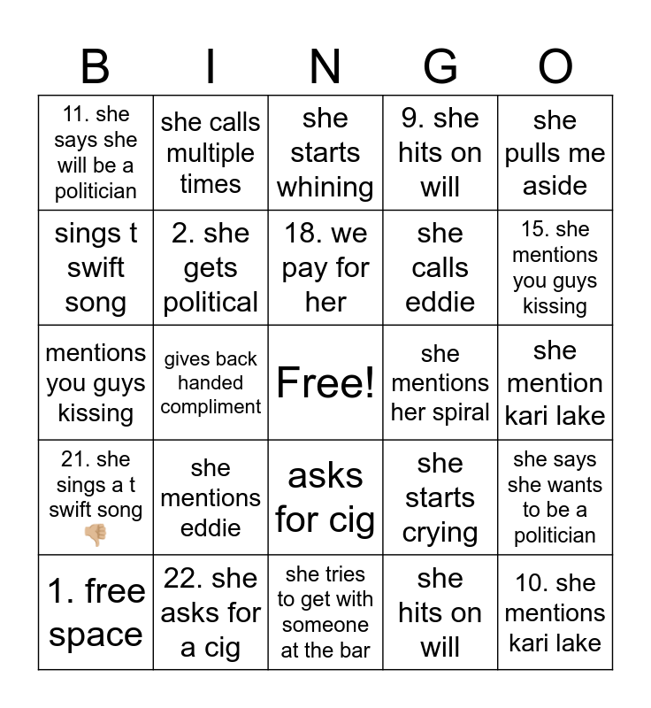 This bingo card has a free space and 53 words: asks for cig, she mentions eddie, orders vodka cran, we pay for her, she mention kari lake, Free!, she calls multiple times, she gets on furniture, she calls eddie, tries to weasel in, mentions you guys kissing, she does karaoke, she hits on will, she says she wants to be a politician, gets black out drunk, she gets politcal, she starts whining, she starts crying, she mentions going to another bar, sings t swift song, gives back handed compliment, she tries to get with someone at the bar, she mentions her spiral, she pulls me aside, asks for cig, asks for cig, asks for cig, asks fo ci, 1. free space, 2. she gets political, 3. she gets on furniture, 4. she starts whining, 5. she calls eddie, 6. she mentions eddie, 7. she pulls me aside, 8. she tries to get with someone at the bar, 9. she hits on will, 10. she mentions kari lake, 11. she says she will be a politician, 12. she gets black out drunk, 13. she calls multiple times, 14. she gives back handed compliment, 15. she mentions you guys kissing, 16. she mentions her spiral, 17. she starts crying, 18. we pay for her, 19. she mentions going to another bar, 20. she does karaoke, 21. she sings a t swift song 👎🏼, 22. she asks for a cig, 23. free space, 24. she tries to weasel in and 25. drinks vodka cran.
