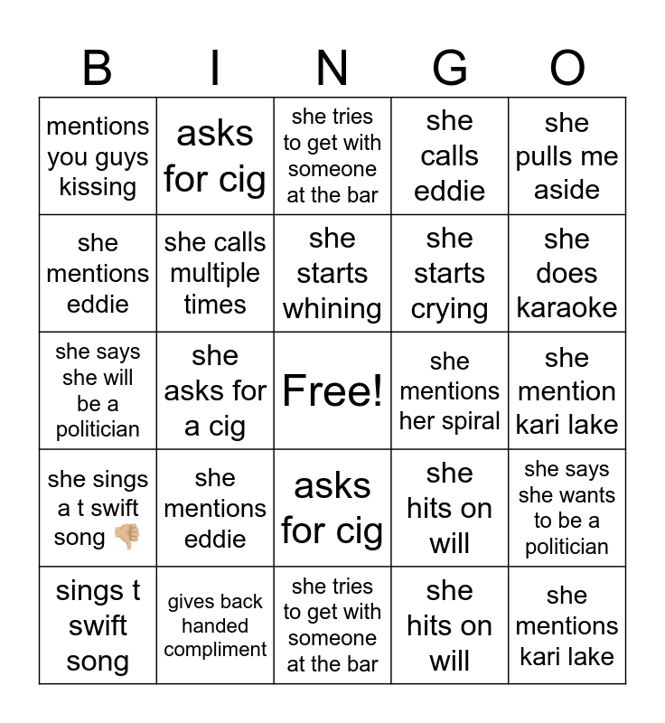 This bingo card has a free space and 54 words: asks for cig, she mentions eddie, orders vodka cran, we pay for her, she mention kari lake, Free!, she calls multiple times, she gets on furniture, she calls eddie, tries to weasel in, mentions you guys kissing, she does karaoke, she hits on will, she says she wants to be a politician, gets black out drunk, she gets politcal, she starts whining, she starts crying, she mentions going to another bar, sings t swift song, gives back handed compliment, she tries to get with someone at the bar, she mentions her spiral, she pulls me aside, asks for cig, asks for cig, asks for cig, asks for cig, asks for cig, free space, she gets political, she gets on furniture, she starts whining, she calls eddie, she mentions eddie, she pulls me aside, she tries to get with someone at the bar, she hits on will, she mentions kari lake, she says she will be a politician, she gets black out drunk, she calls multiple times, she gives back handed compliment, she mentions you guys kissing, she mentions her spiral, she starts crying, we pay for her, she mentions going to another bar, she does karaoke, she sings a t swift song 👎🏼, she asks for a cig, free space, she tries to weasel in and drinks vodka cran.