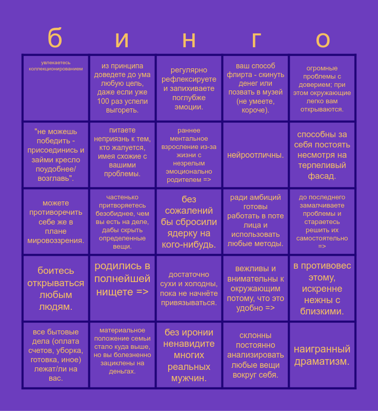 This bingo card has a free space and 24 words: родились в полнейшей нищете =>, материальное положение семьи стало куда выше, но вы болезненно зациклены на деньгах., раннее ментальное взросление из-за жизни с незрелым эмоционально родителем =>, все бытовые дела (оплата счетов, уборка, готовка, иное) лежат/ли на вас., огромные проблемы с доверием; при этом окружающие легко вам открываются., увлекаетесь коллекционированием, "не можешь победить - присоединись и займи кресло поудобнее/возглавь"., из принципа доведете до ума любую цель, даже если уже 100 раз успели выгореть., ради амбиций готовы работать в поте лица и использовать любые методы., достаточно сухи и холодны, пока не начнёте привязываться., нейроотличны., можете противоречить себе же в плане мировоззрения., вежливы и внимательны к окружающим потому, что это удобно =>, в противовес этому, искренне нежны с близкими., питаете неприязнь к тем, кто жалуется, имея схожие с вашими проблемы., склонны постоянно анализировать любые вещи вокруг себя., до последнего замалчиваете проблемы и стараетесь решить их самостоятельно =>, регулярно рефлексируете и запихиваете поглубже эмоции., способны за себя постоять несмотря на терпеливый фасад., частенько притворяетесь безобиднее, чем вы есть на деле, дабы скрыть определенные вещи., наигранный драматизм., боитесь открываться любым людям., ваш способ флирта - скинуть денег или позвать в музей (не умеете, короче). and без иронии ненавидите многих реальных мужчин..