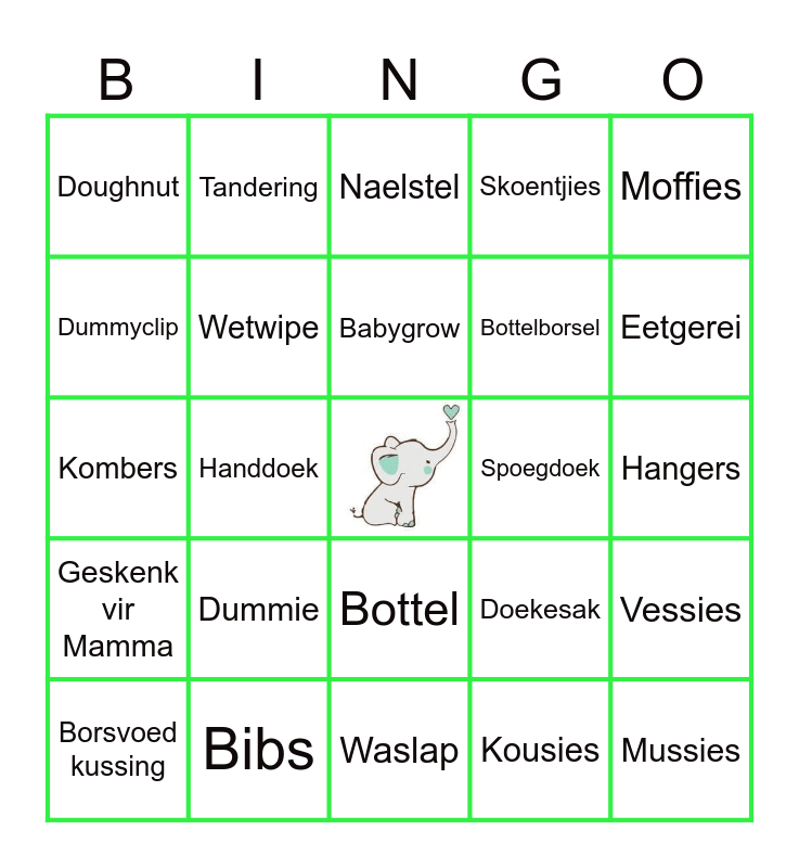 This bingo card has a free space and 24 words: Dummie, Bibs, Babygrow, Borsvoed kussing, Moffies, Doughnut, Dummyclip, Tandering, Spoegdoek, Bottel, Bottelborsel, Kombers, Doekesak, Vessies, Wetwipe, Kousies, Hangers, Naelstel, Eetgerei, Handdoek, Mussies, Geskenk vir Mamma, Skoentjies and Waslap.