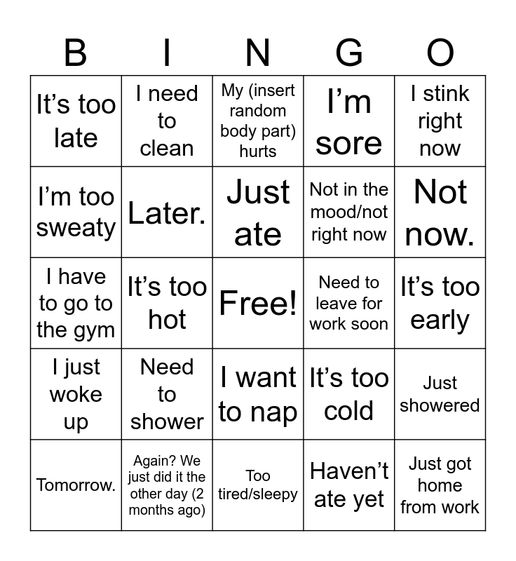 This bingo card has a free space and 24 words: Need to shower, Again? We just did it the other day (2 months ago), Just ate, Tomorrow., I stink right now, It’s too late, I’m too sweaty, I need to clean, Need to leave for work soon, I want to nap, Not in the mood/not right now, I have to go to the gym, It’s too cold, Just showered, Later., Haven’t ate yet, It’s too early, My (insert random body part) hurts, Not now., It’s too hot, Just got home from work, I just woke up, I’m sore and Too tired/sleepy.