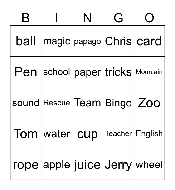 This bingo card has 25 words: water, juice, paper, rope, card, ball, Pen, magic, Bingo, cup, tricks, sound, Teacher, English, school, wheel, Zoo, papago, Mountain, Rescue, Team, apple, Tom, Chris and Jerry.