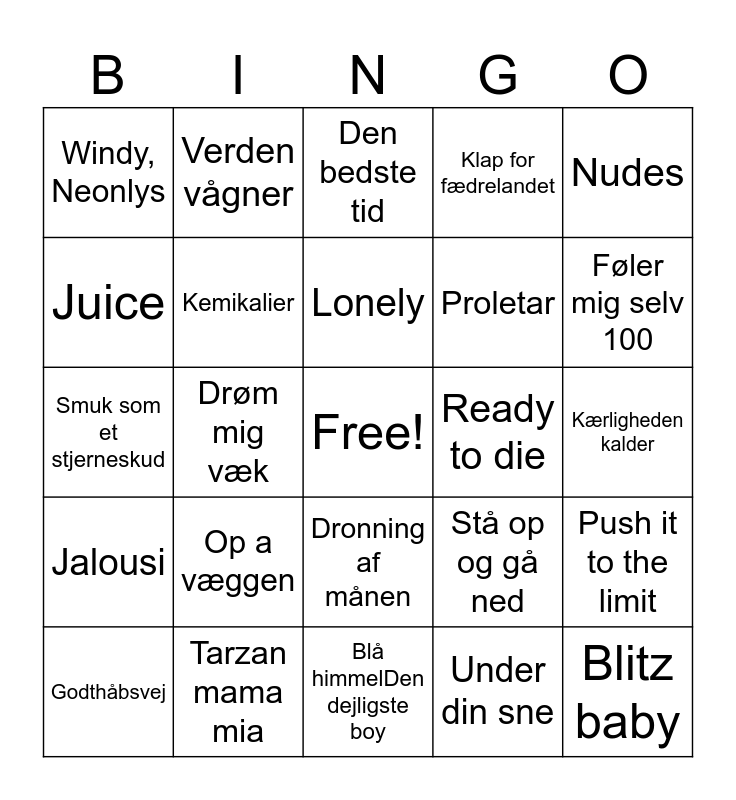 This bingo card has a free space and 49 words: Stor mand, Blitz baby, Solhverv, Blå himmelDen dejligste boy, Op a væggen, Terrier, Verden vågner, Og du blev til en hvid fugl, Juice, All in, Kemikalier, Klap for fædrelandet, Push it to the limit, Stå op og gå ned, Menneskeforbruger, Styrke, Lonely, Ready to die, Vandetta, Nudes, Drøm mig væk, Under din sne, Windy, Neonlys, Proletar, Amsterdam, Føler mig selv 100, Godthåbsvej, Magi i luften, Dronning af månen, Jalousi, Jeg ka' rigtig god li' dig, Elskes af dig, Vilde kaniner, Indianer, Tarzan mama mia, Alle mine veninder, kom tilbage nu, Malaga, Kærligheden kalder, En dag tilbage, Jeg vil ha' dig for mig selv, Vi to, Der står et billede af dig på mit bord, Elskovspony, Smuk som et stjerneskud, Den bedste tid, Pas på den knaldrøde gummibåd, Hjem til Århus and Doctor jones.