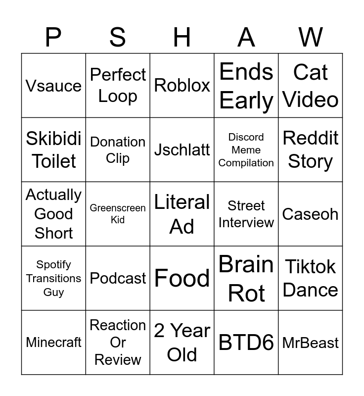 This bingo card has 25 words: Podcast, 2 Year Old, Jschlatt, Minecraft, Cat Video, Vsauce, Skibidi Toilet, Perfect Loop, Street Interview, Food, Discord Meme Compilation, Actually Good Short, Brain Rot, Tiktok Dance, Donation Clip, MrBeast, Caseoh, Roblox, Reddit Story, Greenscreen Kid, Literal Ad, Reaction Or Review, Spotify Transitions Guy, Ends Early and BTD6.