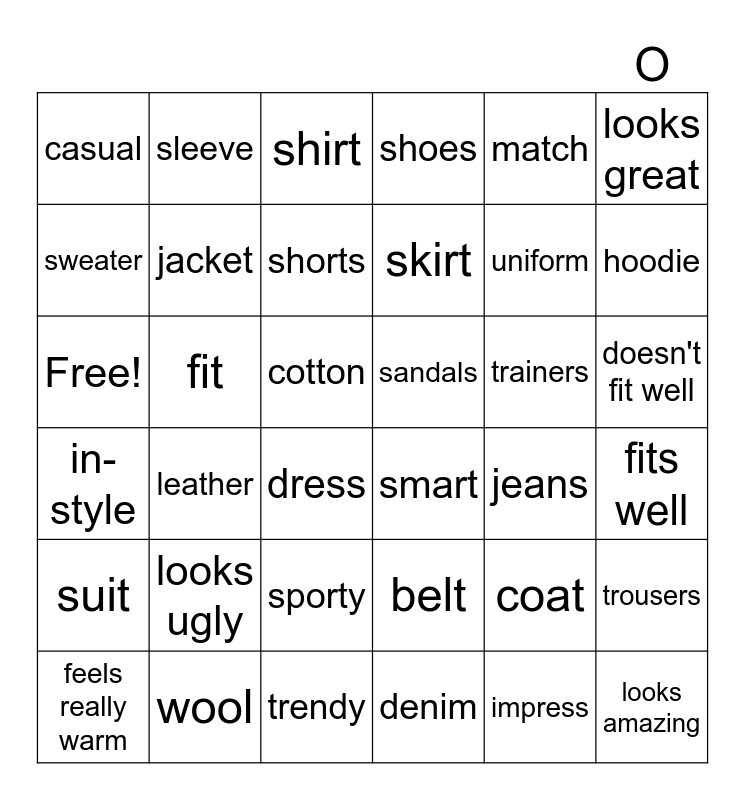 This bingo card has 36 words: belt, sporty, denim, sweater, in-style, sandals, jacket, trendy, match, coat, hoodie, shoes, trousers, fit, skirt, casual, suit, trainers, Free!, shirt, cotton, leather, smart, dress, jeans, sleeve, uniform, wool, shorts, looks great, looks amazing, feels really warm, fits well, doesn't fit well, looks ugly and impress.