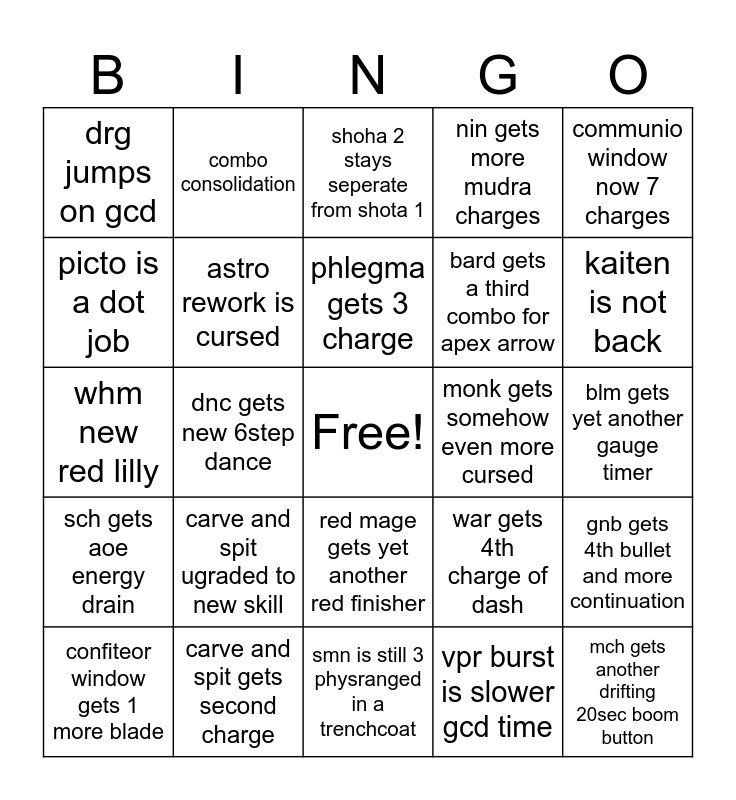 This bingo card has a free space and 24 words: carve and spit ugraded to new skill, carve and spit gets second charge, phlegma gets 3 charge, confiteor window gets 1 more blade, communio window now 7 charges, drg jumps on gcd, picto is a dot job, combo consolidation, monk gets somehow even more cursed, red mage gets yet another red finisher, bard gets a third combo for apex arrow, whm new red lilly, war gets 4th charge of dash, gnb gets 4th bullet and more continuation, astro rework is cursed, vpr burst is slower gcd time, blm gets yet another gauge timer, shoha 2 stays seperate from shota 1, kaiten is not back, dnc gets new 6step dance, mch gets another drifting 20sec boom button, sch gets aoe energy drain, nin gets more mudra charges and smn is still 3 physranged in a trenchcoat.