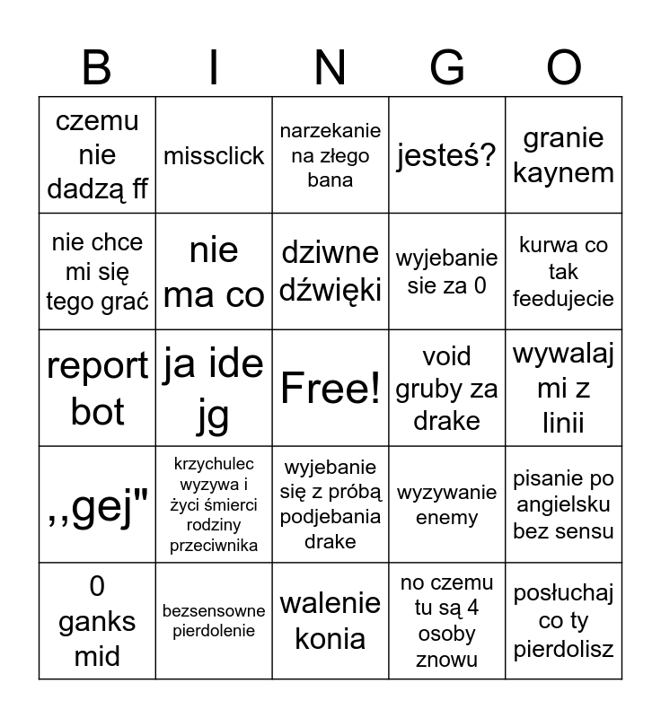 This bingo card has a free space and 24 words: krzychulec wyzywa i życi śmierci rodziny przeciwnika, bezsensowne pierdolenie, dziwne dźwięki, 0 ganks mid, granie kaynem, czemu nie dadzą ff, nie chce mi się tego grać, missclick, void gruby za drake, wyjebanie się z próbą podjebania drake, wyjebanie sie za 0, report bot, wyzywanie enemy, pisanie po angielsku bez sensu, nie ma co, no czemu tu są 4 osoby znowu, wywalaj mi z linii, narzekanie na złego bana, kurwa co tak feedujecie, ja ide jg, posłuchaj co ty pierdolisz, ,,gej", jesteś? and walenie konia.