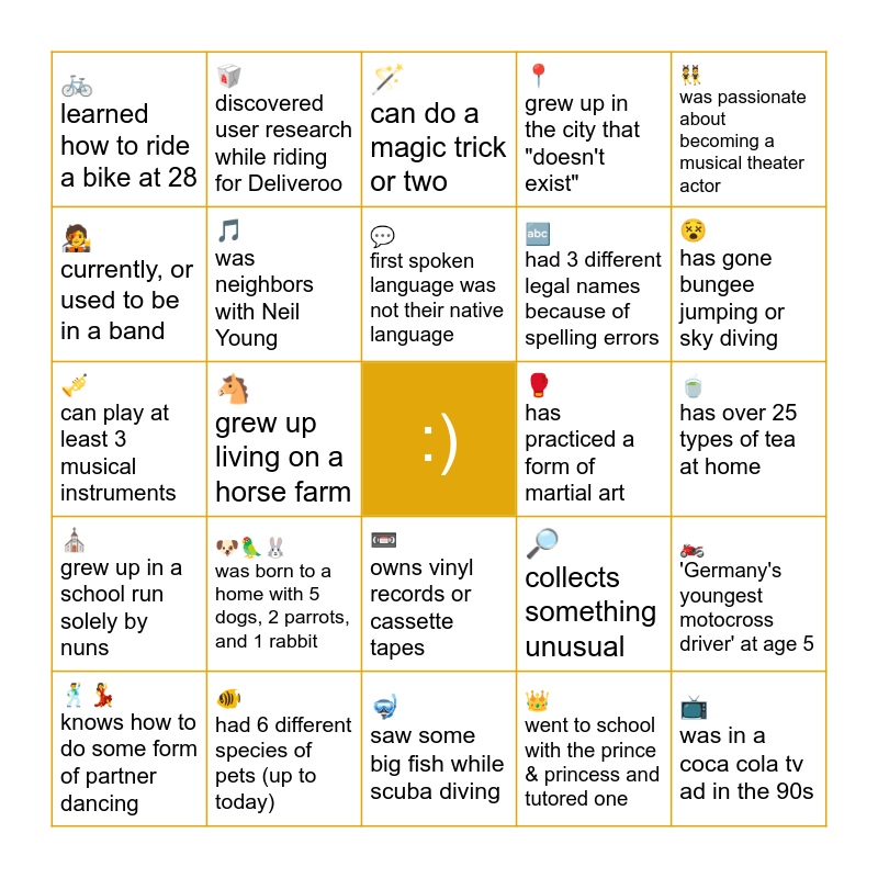 This bingo card has a free space and 24 words: πΆπ¦π° was born to a home with 5 dogs, 2 parrots, and 1 rabbit, π had 6 different species of pets (up to today), π¬ first spoken language was not their native language, πΊπ knows how to do some form of partner dancing, π― was passionate about becoming a musical theater actor, π² learned how to ride a bike at 28, π§βπ€ currently, or used to be in a band, π₯‘ discovered user research while riding for Deliveroo, π₯ has practiced a form of martial art, πΌ owns vinyl records or cassette tapes, π€ had 3 different legal names because of spelling errors, πΊ can play at least 3 musical instruments, π collects something unusual, ποΈ 'Germany's youngest motocross driver' at age 5, π΅ was neighbors with Neil Young, π went to school with the prince & princess and tutored one, π΅ has over 25 types of tea at home, πͺ can do a magic trick or two, π΅ has gone bungee jumping or sky diving, π΄ grew up living on a horse farm, πΊ was in a coca cola tv ad in the 90s, βͺ grew up in a school run solely by nuns, π grew up in the city that "doesn't exist" and π€Ώ saw some big fish while scuba diving.