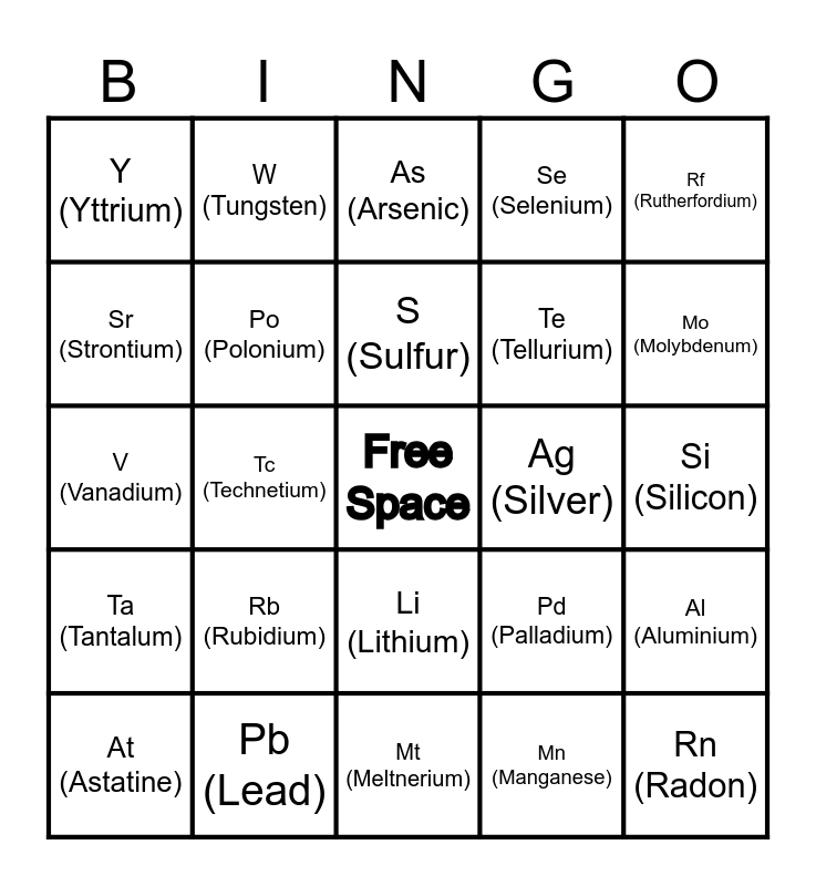 This bingo card has a free space and 88 words: H (Hydrogen), He (Helium), Li (Lithium), Be (Beryillium), B (Boron), C (Carbon), N (Nitrogen), O (Oxygen), F (Fluorine), Ne (Neon), Na (Sodium), Mg (Magnesium), Al (Aluminium), Si (Silicon), P (Phosphorus), S (Sulfur), Cl (Chlorine), Ar (Argon), K (Potassium), Ca (Calcium), Sc (Scandium), Ti (Titanium), V (Vanadium), Cr (Chromium), Mn (Manganese), Fe (Iron), Cu (Copper), Zn (Zinc), Ga (Gallium), Ge (Germanium), As (Arsenic), Se (Selenium), Br (Bromine), Kr (Krypton), Rb (Rubidium), Sr (Strontium), Y (Yttrium), Zr (Zirconium), Nb (Niobium), Mo (Molybdenum), Tc (Technetium), Ru (Ruthenium), Rh (Rhodium), Pd (Palladium), Ag (Silver), Cd (Cadmium), In (Indium), Sn (Tin), Sb (Antimony), Te (Tellurium), I (Iodine), Xe (Xenon), Cs (Cesium), Ba (Barium), La (Lanthanum), Hf (Hafnium), Ta (Tantalum), W (Tungsten), Re (Rhenium), Os (Osmium), Ir (Iridium), Pt (Platinum), Au (Gold), Hg (Mercury), Tl (Thallium), Pb (Lead), Bi (Bismuth), Po (Polonium), At (Astatine), Rn (Radon), Fr (Francium), Ra (Radium), Ac (Actinium), Rf (Rutherfordium), Db (Dubnium), Sg (Seaborgium), Bh (Bohrium), Hs (Hassium), Mt (Meltnerium), Ds (Darmstadtium), Rg (Roengenium), Cn (Copernicium), Nh (Nihonium), Fl (Flerovium), Mc (Moscovium), Lv (Livermorium), Ts (Tennessine) and Og (Oganesson).