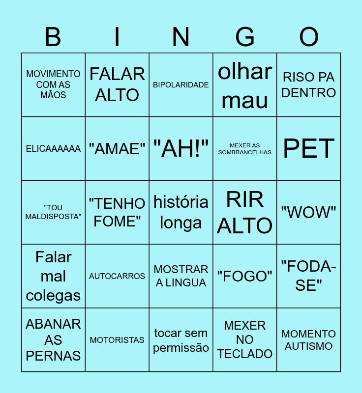 This bingo card has a free space and 24 words: AUTOCARROS, MOTORISTAS, "AH!", ABANAR AS PERNAS, RISO PA DENTRO, MOVIMENTO COM AS MÃOS, ELICAAAAAA, FALAR ALTO, RIR ALTO, MOSTRAR A LINGUA, MEXER AS SOMBRANCELHAS, "TOU MALDISPOSTA", "FOGO", "FODA-SE", "AMAE", MEXER NO TECLADO, "WOW", BIPOLARIDADE, PET, "TENHO FOME", MOMENTO AUTISMO, Falar mal colegas, olhar mau and tocar sem permissão.