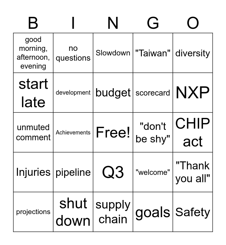 This bingo card has a free space and 24 words: pipeline, shut down, budget, projections, diversity, good morning, afternoon, evening, start late, no questions, "don't be shy", Q3, scorecard, unmuted comment, "welcome", "Thank you all", development, goals, CHIP act, Slowdown, NXP, Achievements, Safety, Injuries, "Taiwan" and supply chain.