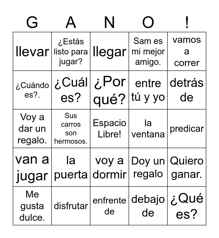 This bingo card has a free space and 29 words: Me gusta dulce., No me gusta trabajar., Sus carros son hermosos., Nuestro perro está enfermo., llevar, llegar, ¿Cuál es?, la puerta, la ventana, disfrutar, predicar, ¿Qué es?, enfrente de, debajo de, detrás de, conmigo, voy a dormir, van a jugar, vamos a correr, Voy a dar un regalo., Doy un regalo, poco tiempo, entre tú y yo, ¿Cuándo es?., Sam es mi mejor amigo., ¿Estás listo para jugar?, Quiero ganar., ¿Por qué? and Dónde está?.