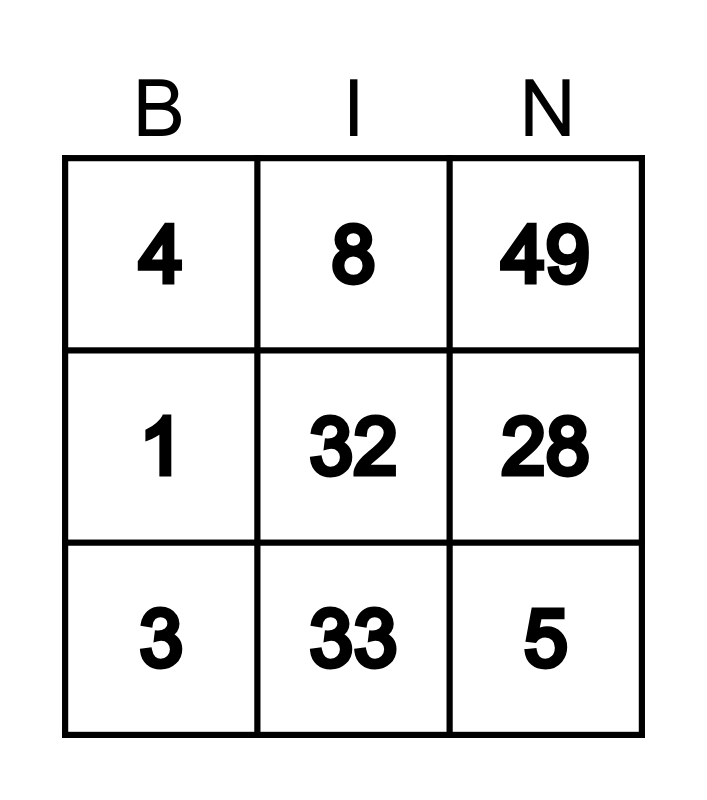 This bingo card has a free space and 9 words: 3, 49, 8, 1, 4, 28, 5, 2 and 33.
