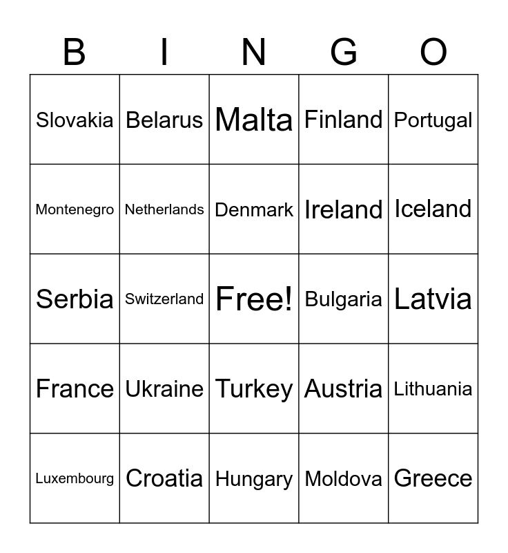 This bingo card has a free space and 36 words: Spain, Germany, Italy, Netherlands, Austria, France, Denmark, Sweden, Portugal, UK, Switzerland, Finland, Norway, Bulgaria, Iceland, Slovakia, Poland, Ukraine, Greece, Malta, Latvia, Lithuania, Croatia, Luxembourg, Hungary, Belarus, Serbia, Albania, Ireland, Montenegro, Kosovo, Andorra, Moldova, Turkey, Gibraltar and Russia.