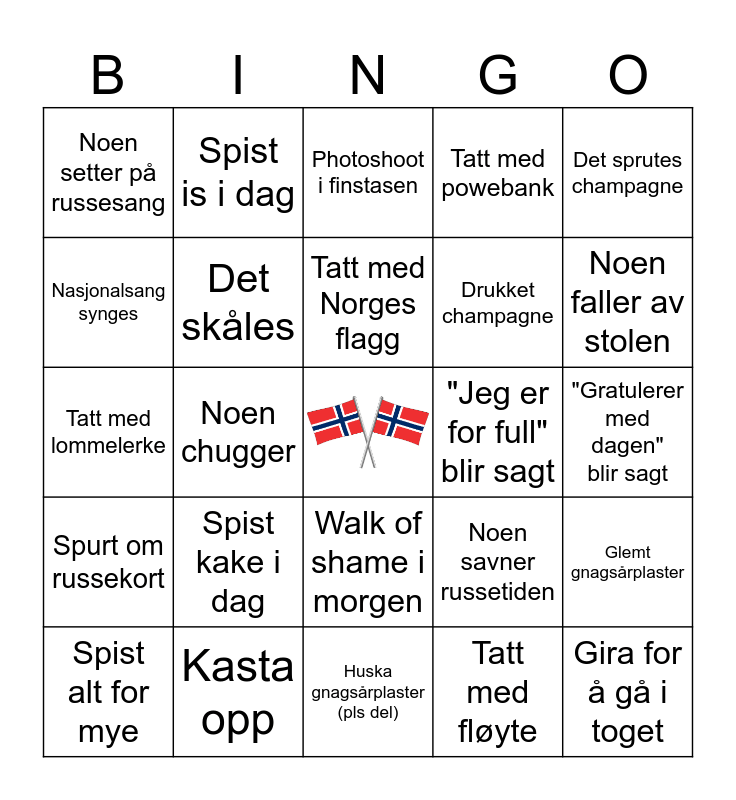 This bingo card has a free space and 24 words: Spist kake i dag, Kasta opp, Tatt med Norges flagg, Spist alt for mye, Det sprutes champagne, Noen setter på russesang, Nasjonalsang synges, Spist is i dag, "Jeg er for full" blir sagt, Walk of shame i morgen, Drukket champagne, Tatt med lommelerke, Noen savner russetiden, Glemt gnagsårplaster, Det skåles, Tatt med fløyte, "Gratulerer med dagen" blir sagt, Photoshoot i finstasen, Noen faller av stolen, Noen chugger, Gira for å gå i toget, Spurt om russekort, Tatt med powebank and Huska gnagsårplaster (pls del).