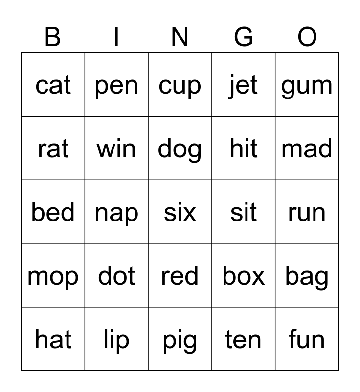 This bingo card has 25 words: dot, pig, dog, hat, gum, cat, rat, pen, sit, red, hit, bed, box, bag, win, fun, run, cup, mad, nap, six, lip, mop, jet and ten.