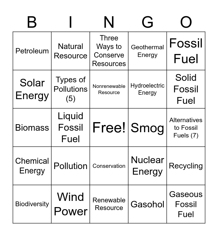 This bingo card has a free space and 25 words: Pollution, Renewable Resource, Nonrenewable Resource, Biodiversity, Fossil Fuel, Petroleum, Solar Energy, Natural Resource, Smog, Conservation, Hydroelectric Energy, Biomass, Nuclear Energy, Recycling, Types of Pollutions (5), Types of Fossil Fuels (3), Alternatives to Fossil Fuels (7), Three Ways to Conserve Resources, Solid Fossil Fuel, Liquid Fossil Fuel, Gaseous Fossil Fuel, Wind Power, Chemical Energy, Geothermal Energy and Gasohol.