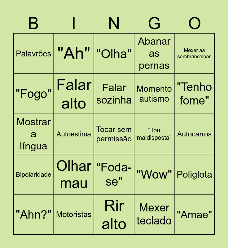 This bingo card has a free space and 29 words: "Ahn?", "O que?", Autoestima, Perversa, Palavrões, "Olha", Falar alto, Olhar mau, "Tou maldisposta", Motoristas, Autocarros, "Amae", Rir alto, Mexer teclado, "Tenho fome", Pet, "Foda-se", Bipolaridade, Mexer aa sombrancelhas, Mostrar a língua, "Wow", Elicaaaaaa, Momento autismo, "Fogo", Abanar as pernas, "Ah", Poliglota, Falar sozinha and Barulhos de dinossauro.
