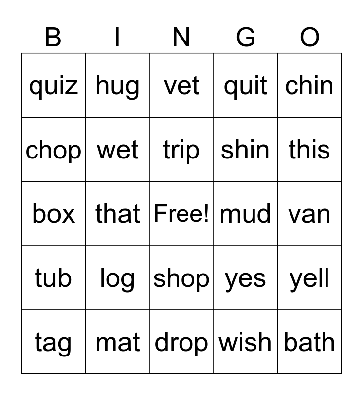 This bingo card has a free space and 24 words: log, mat, trip, tag, chin, quiz, chop, hug, mud, shop, shin, box, yes, yell, wet, wish, van, vet, this, that, bath, tub, quit and drop.