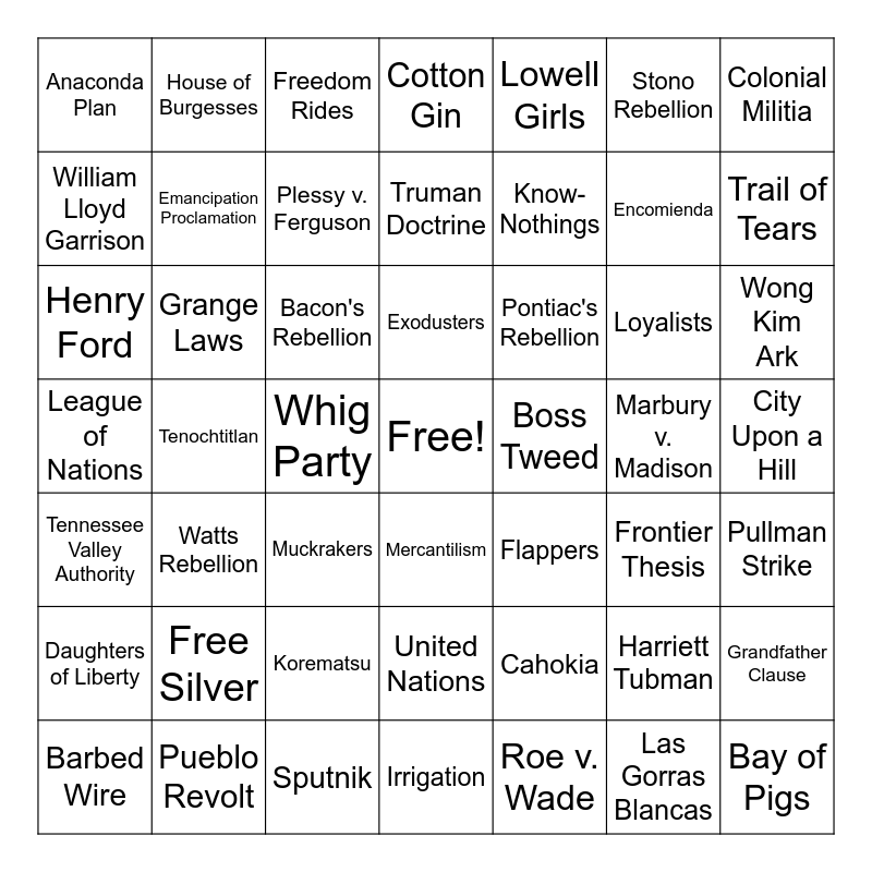This bingo card has a free space and 48 words: Cahokia, Encomienda, Irrigation, Tenochtitlan, Bacon's Rebellion, City Upon a Hill, House of Burgesses, Pueblo Revolt, Stono Rebellion, Mercantilism, Colonial Militia, Cotton Gin, Loyalists, Pontiac's Rebellion, Daughters of Liberty, Marbury v. Madison, William Lloyd Garrison, Trail of Tears, Harriett Tubman, Lowell Girls, Know-Nothings, Whig Party, Anaconda Plan, Emancipation Proclamation, Grandfather Clause, Plessy v. Ferguson, Wong Kim Ark, Barbed Wire, Exodusters, Grange Laws, Las Gorras Blancas, Boss Tweed, Pullman Strike, Free Silver, League of Nations, Flappers, Frontier Thesis, Henry Ford, Muckrakers, Korematsu, Tennessee Valley Authority, Bay of Pigs, Freedom Rides, Sputnik, Truman Doctrine, United Nations, Watts Rebellion and Roe v. Wade.
