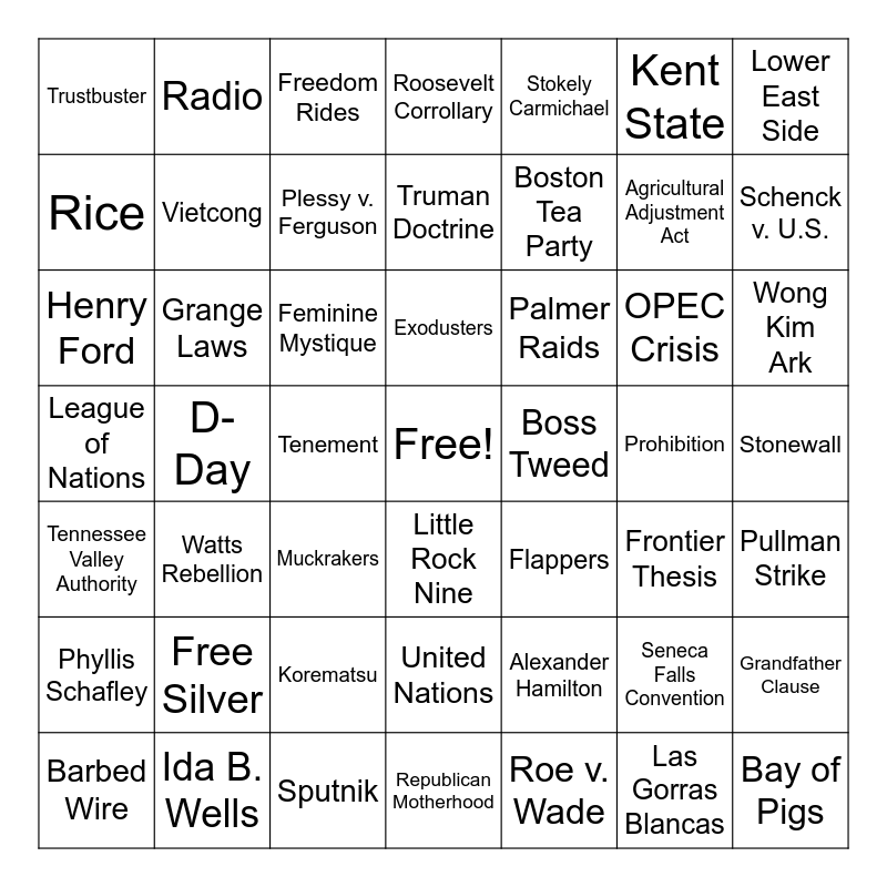 This bingo card has a free space and 48 words: Alexander Hamilton, Agricultural Adjustment Act, Republican Motherhood, D-Day, Feminine Mystique, Stonewall, Radio, Ida B. Wells, Kent State, Little Rock Nine, Lower East Side, Roosevelt Corrollary, OPEC Crisis, Palmer Raids, Phyllis Schafley, Prohibition, Rice, Schenck v. U.S., Seneca Falls Convention, Stokely Carmichael, Boston Tea Party, Tenement, Trustbuster, Vietcong, Grandfather Clause, Plessy v. Ferguson, Wong Kim Ark, Barbed Wire, Exodusters, Grange Laws, Las Gorras Blancas, Boss Tweed, Pullman Strike, Free Silver, League of Nations, Flappers, Frontier Thesis, Henry Ford, Muckrakers, Korematsu, Tennessee Valley Authority, Bay of Pigs, Freedom Rides, Sputnik, Truman Doctrine, United Nations, Watts Rebellion and Roe v. Wade.