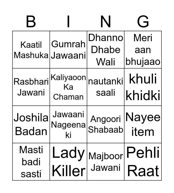 This bingo card has 39 words: paapi chudail, nakchadi, nakhrewali, nautanki saali, pyaasa tan, lut gayi laila, khuli khidki, Tere se Kya hoga, Rasbhari Jawani, Pehli Raat, Nayee item, Meri aan bhujaao, Masti badi sasti, Majboor Jawani, Lady Killer, Ladki Jawan Patosi Pareshaan, Krodh Jawani Ka, Kaatil Mashuka, Kashmiri Shabab, Kamsin Apsara, Kaliyaoon Ka Chaman, Jwaala Meri Jaan, Joshila Badan, Jawaani Nageena ki, Janam Janam ki Pyaasi, Husn Ki Pukar, Husn Ka Asar, Hawas Hi Hawas, Hawas Ki pujaari, Gumrah Jawaani, Garam Karo na, Ehsaas jawani Ka, Dhanno Dhabe Wali, Chingaari, Bhutni, Bali umariya, Andar Ki bhookh, Akeli Jawaani, Angoori Shabaab and Papi Padosan.