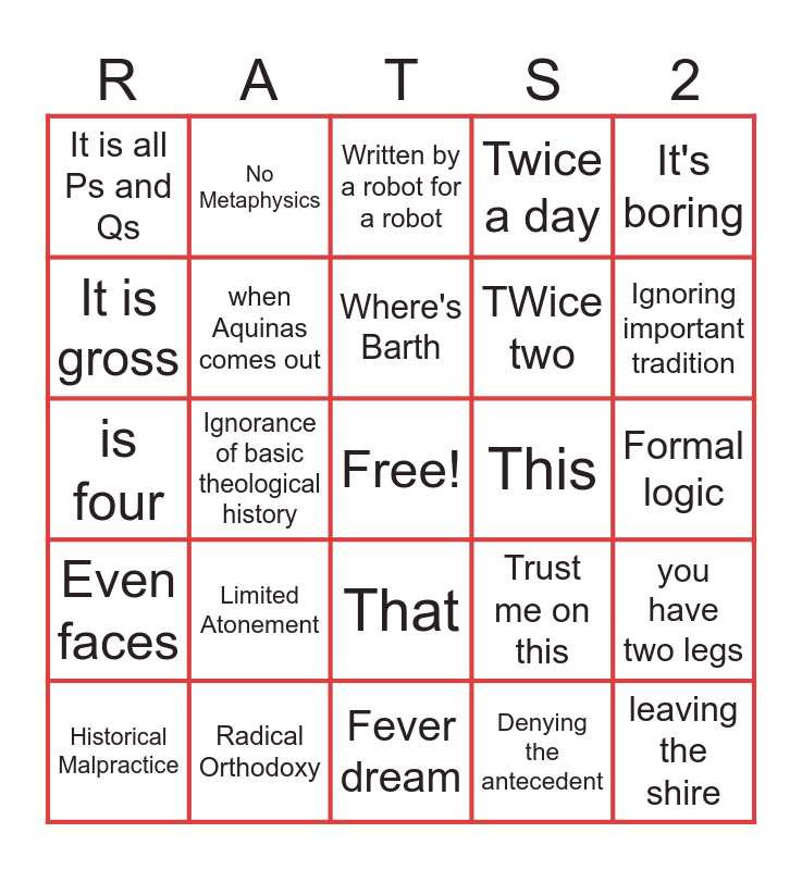 This bingo card has a free space and 24 words: Limited Atonement, Radical Orthodoxy, Where's Barth, Historical Malpractice, It's boring, It is all Ps and Qs, It is gross, No Metaphysics, This, That, TWice two, is four, Trust me on this, you have two legs, when Aquinas comes out, Denying the antecedent, Formal logic, Written by a robot for a robot, Ignoring important tradition, Ignorance of basic theological history, leaving the shire, Even faces, Twice a day and Fever dream.