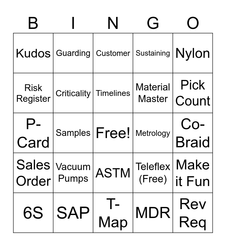 This bingo card has a free space and 25 words: Vacuum Pumps, T-Map, Timelines, 6S, Nylon, Kudos, Risk Register, Guarding, Metrology, ASTM, Material Master, P-Card, Teleflex (Free), Make it Fun, Criticality, Incoming Inspection, Co-Braid, Customer, Pick Count, Samples, Rev Req, SAP, Sales Order, Sustaining and MDR.