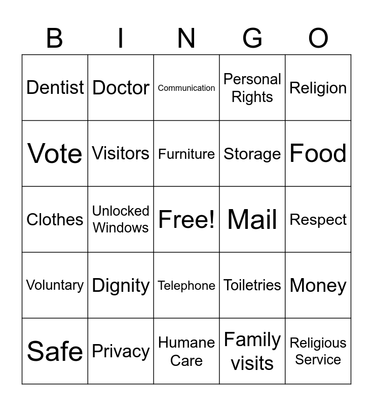 This bingo card has a free space and 24 words: Dignity, Privacy, Furniture, Safe, Religion, Dentist, Vote, Doctor, Mail, Telephone, Storage, Clothes, Toiletries, Money, Visitors, Family visits, Respect, Communication, Food, Unlocked Windows, Religious Service, Voluntary, Personal Rights and Humane Care.