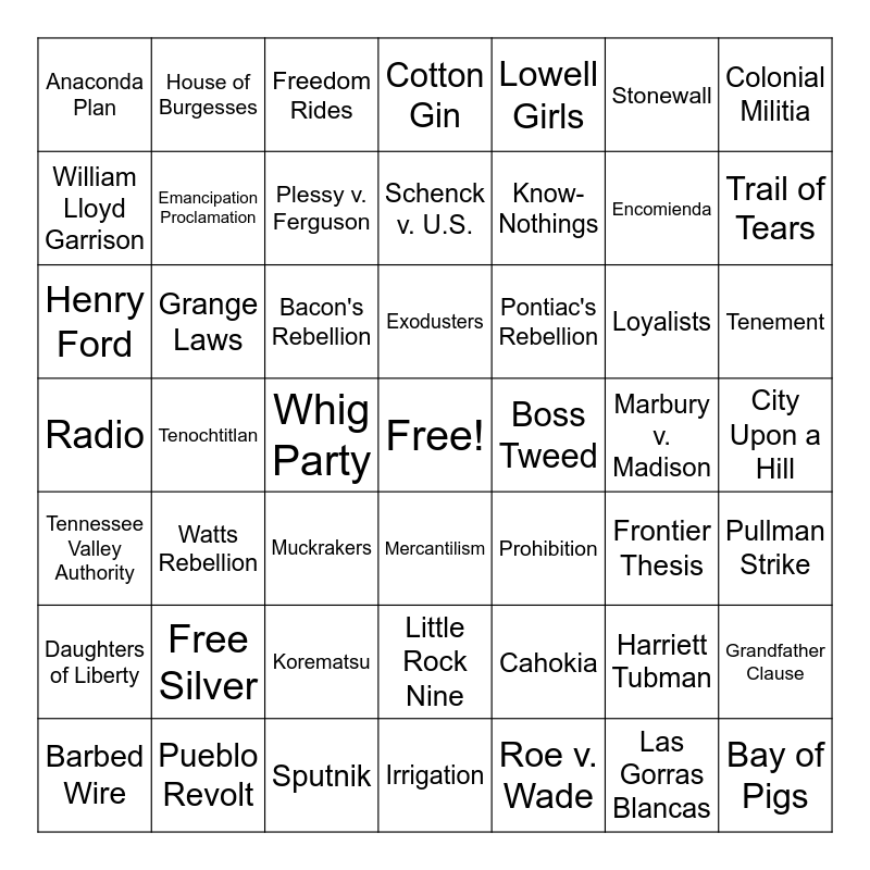 This bingo card has a free space and 48 words: Cahokia, Encomienda, Irrigation, Tenochtitlan, Bacon's Rebellion, City Upon a Hill, House of Burgesses, Pueblo Revolt, Stonewall, Mercantilism, Colonial Militia, Cotton Gin, Loyalists, Pontiac's Rebellion, Daughters of Liberty, Marbury v. Madison, William Lloyd Garrison, Trail of Tears, Harriett Tubman, Lowell Girls, Know-Nothings, Whig Party, Anaconda Plan, Emancipation Proclamation, Grandfather Clause, Plessy v. Ferguson, Tenement, Barbed Wire, Exodusters, Grange Laws, Las Gorras Blancas, Boss Tweed, Pullman Strike, Free Silver, Radio, Prohibition, Frontier Thesis, Henry Ford, Muckrakers, Korematsu, Tennessee Valley Authority, Bay of Pigs, Freedom Rides, Sputnik, Schenck v. U.S., Little Rock Nine, Watts Rebellion and Roe v. Wade.