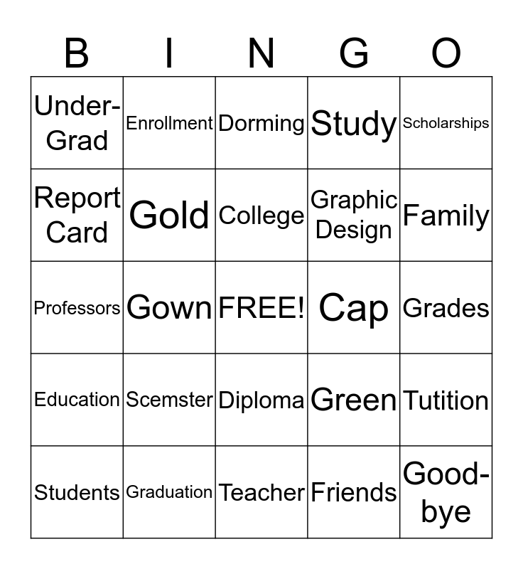 This bingo card has a free space and 24 words: Scemster, Graduation, College, Students, Scholarships, Under-Grad, Report Card, Enrollment, Cap, Diploma, Graphic Design, Professors, Green, Tutition, Gold, Friends, Grades, Dorming, Family, Gown, Good-bye, Education, Study and Teacher.