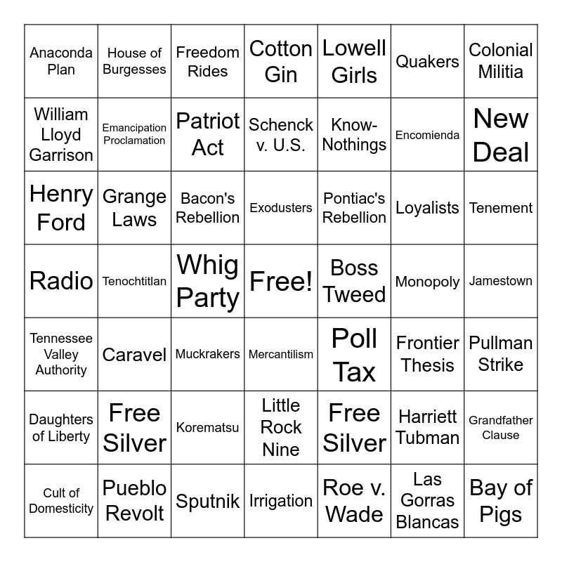 This bingo card has a free space and 48 words: Free Silver, Encomienda, Irrigation, Tenochtitlan, Bacon's Rebellion, Jamestown, House of Burgesses, Pueblo Revolt, Quakers, Mercantilism, Colonial Militia, Cotton Gin, Loyalists, Pontiac's Rebellion, Daughters of Liberty, Monopoly, William Lloyd Garrison, New Deal, Harriett Tubman, Lowell Girls, Know-Nothings, Whig Party, Anaconda Plan, Emancipation Proclamation, Grandfather Clause, Patriot Act, Tenement, Cult of Domesticity, Exodusters, Grange Laws, Las Gorras Blancas, Boss Tweed, Pullman Strike, Free Silver, Radio, Poll Tax, Frontier Thesis, Henry Ford, Muckrakers, Korematsu, Tennessee Valley Authority, Bay of Pigs, Freedom Rides, Sputnik, Schenck v. U.S., Little Rock Nine, Caravel and Roe v. Wade.