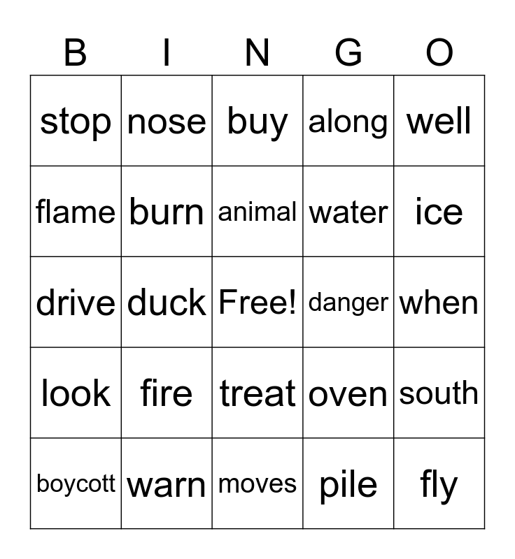 This bingo card has a free space and 29 words: boycott, cozy, duck, flap, stop, buy, burn, fire, danger, warn, when, fly, moves, pile, ice, hang, treat, look, well, drive, oven, deep, water, flame, along, nose, south, animal and use.