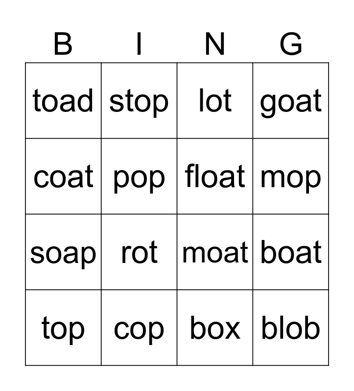 This bingo card has 16 words: cop, boat, lot, toad, soap, stop, moat, box, coat, pop, top, goat, rot, mop, float and blob.