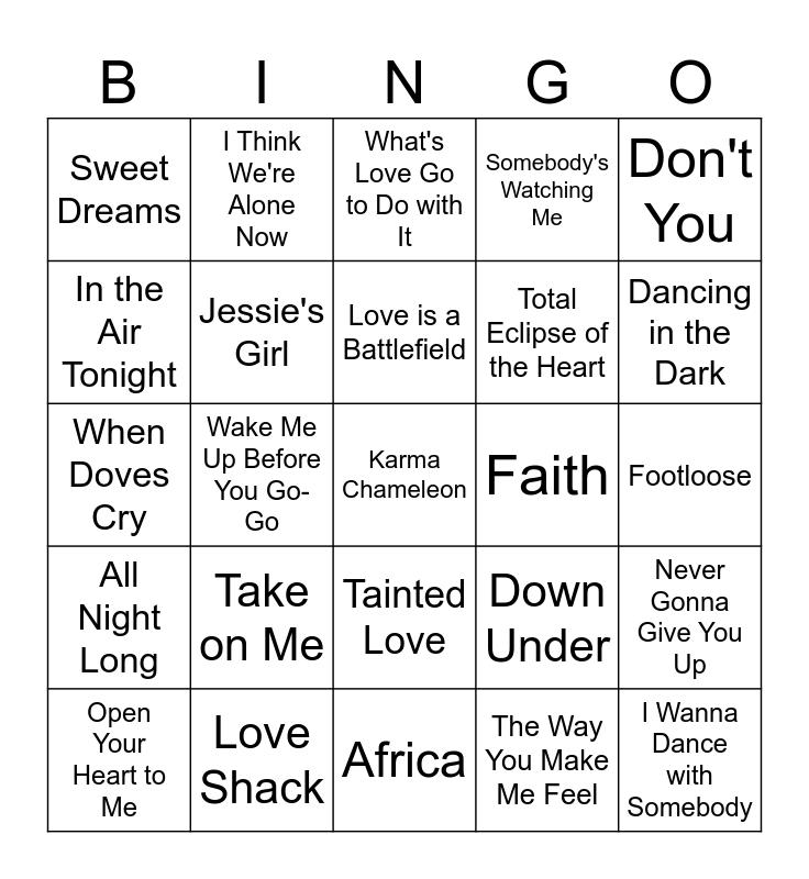 This bingo card has 25 words: Take on Me, Africa, Love is a Battlefield, Open Your Heart to Me, Don't You, Sweet Dreams, In the Air Tonight, I Think We're Alone Now, Faith, Tainted Love, Total Eclipse of the Heart, When Doves Cry, Down Under, Never Gonna Give You Up, Jessie's Girl, I Wanna Dance with Somebody, Footloose, What's Love Go to Do with It, Dancing in the Dark, Wake Me Up Before You Go-Go, Karma Chameleon, Love Shack, All Night Long, Somebody's Watching Me and The Way You Make Me Feel.
