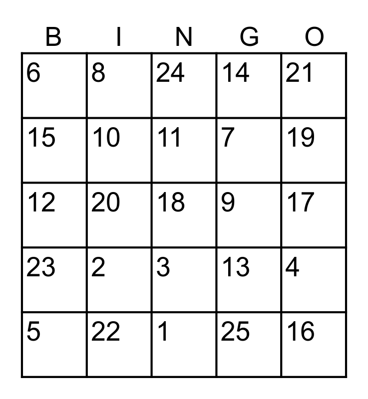 This bingo card has 25 words: 2, 1, 11, 5, 21, 6, 15, 8, 9, 3, 7, 12, 13, 4, 10, 16, 17, 24, 19, 20, 18, 22, 23, 14 and 25.