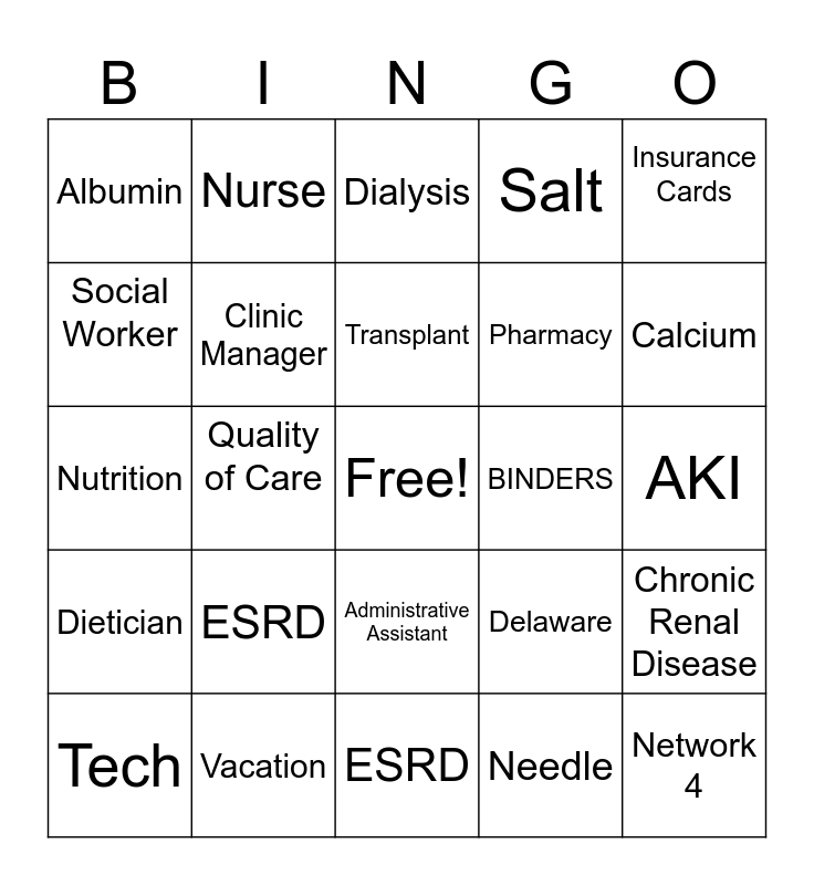 This bingo card has a free space and 24 words: ESRD, Vacation, Transplant, Tech, Insurance Cards, Albumin, Social Worker, Nurse, BINDERS, Administrative Assistant, Pharmacy, Nutrition, Delaware, Chronic Renal Disease, Clinic Manager, Needle, AKI, Dialysis, Calcium, Quality of Care, Network 4, Dietician, Salt and ESRD.