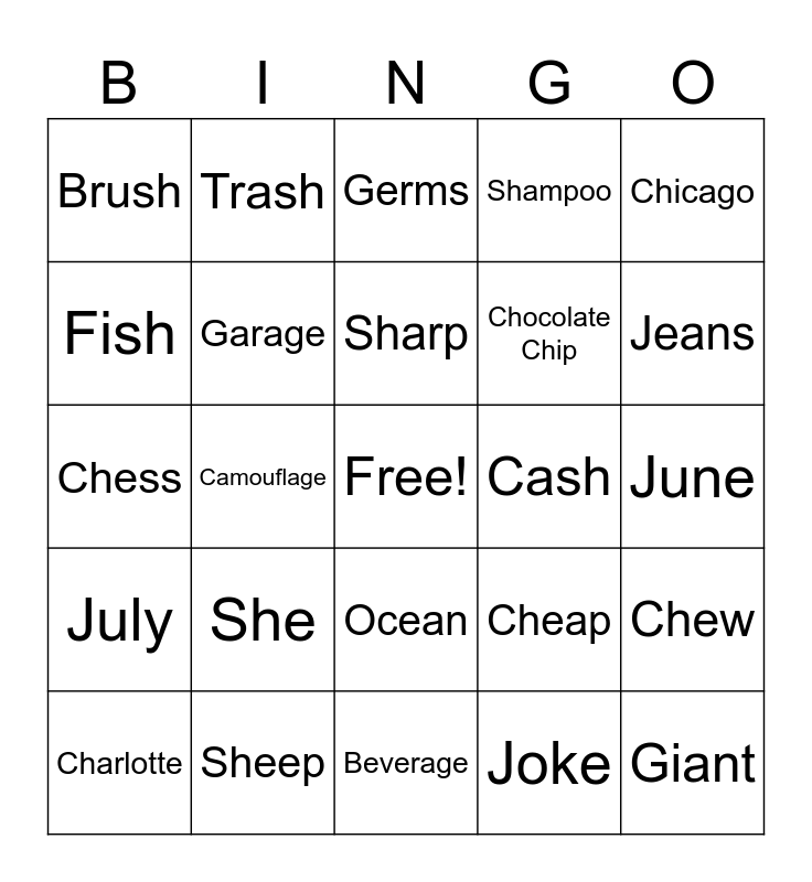 This bingo card has a free space and 24 words: She, Sheep, Sharp, Charlotte, Chicago, Brush, Fish, Trash, Cash, Ocean, Chocolate Chip, Chess, Cheap, Chew, Garage, Joke, June, Germs, Jeans, Camouflage, Giant, July, Shampoo and Beverage.