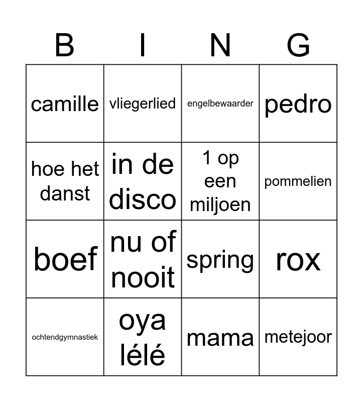 This bingo card has 17 words: mama, ochtendgymnastiek, engelbewaarder, camille, nu of nooit, pedro, rox, 1 op een miljoen, pommelien, in de disco, oya lélé, spring, hoe het danst, vliegerlied, boef, allemaal and metejoor.