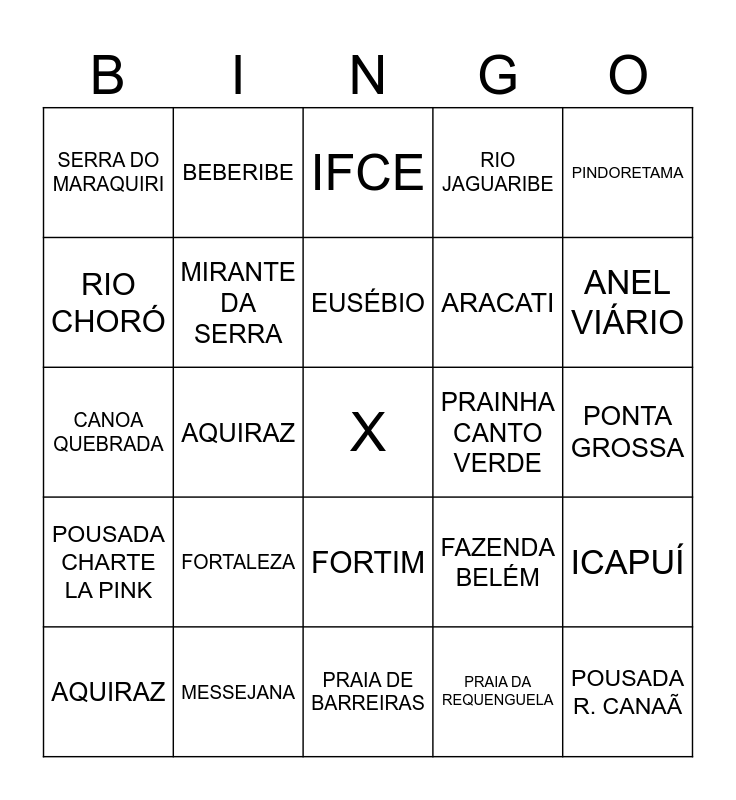 This bingo card has a free space and 24 words: FORTALEZA, MESSEJANA, EUSÉBIO, AQUIRAZ, PINDORETAMA, SERRA DO MARAQUIRI, RIO CHORÓ, BEBERIBE, PRAINHA CANTO VERDE, FORTIM, ARACATI, CANOA QUEBRADA, FAZENDA BELÉM, ICAPUÍ, MIRANTE DA SERRA, PRAIA DA REQUENGUELA, PONTA GROSSA, IFCE, ANEL VIÁRIO, AQUIRAZ, POUSADA R. CANAÃ, POUSADA CHARTE LA PINK, RIO JAGUARIBE and PRAIA DE BARREIRAS.