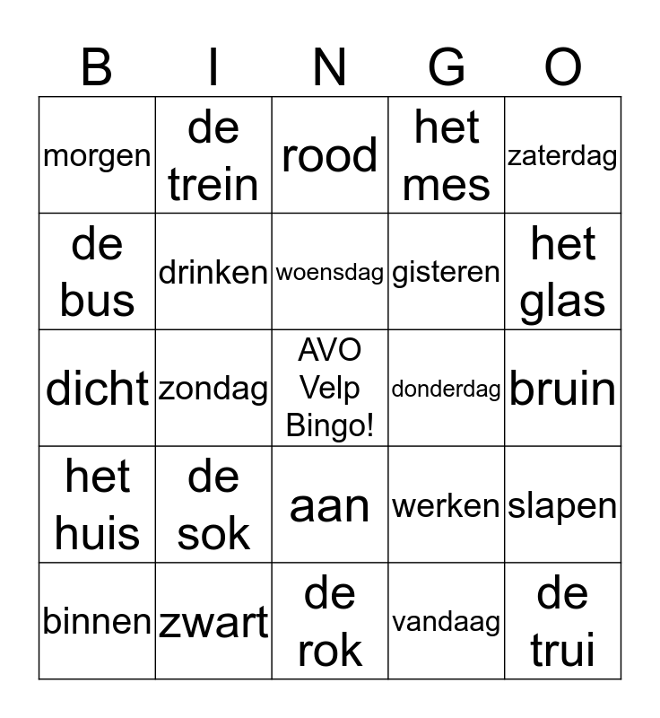 This bingo card has a free space and 52 words: de jas, de trui, de broek, de rok, de sok, de schoen, de trein, de fiets, de bus, lopen, drinken, eten, slapen, werken, maandag, dinsdag, woensdag, donderdag, vrijdag, zaterdag, zondag, vandaag, morgen, gisteren, de stoel, de tafel, de bank, het bed, het glas, de vork, de lepel, het mes, het raam, de muur, de vloer, rood, zwart, geel, groen, oranje, paars, bruin, het huis, de tas, aan, uit, open, dicht, boven, onder, binnen and buiten.
