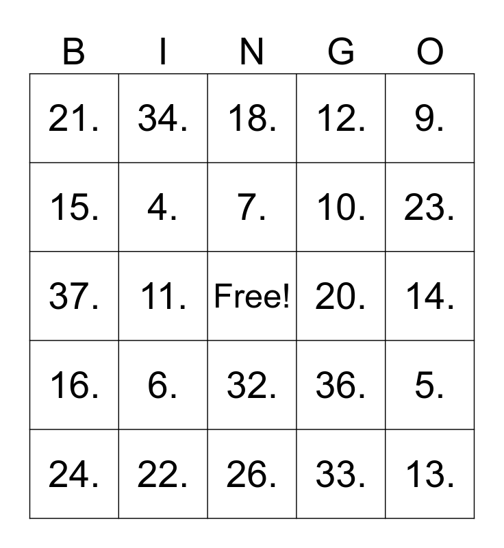This bingo card has a free space and 38 words: 1., 2., 3., 4., 5., 6., 7., 8., 9., 10., 11., 12., 13., 14., 15., 16., 17., 18., 19., 20., 21., 22., 23., 24., 25., 26., 27., 28., 29., 30., 31., 32., 33., 34., 35., 36., 37. and 38..