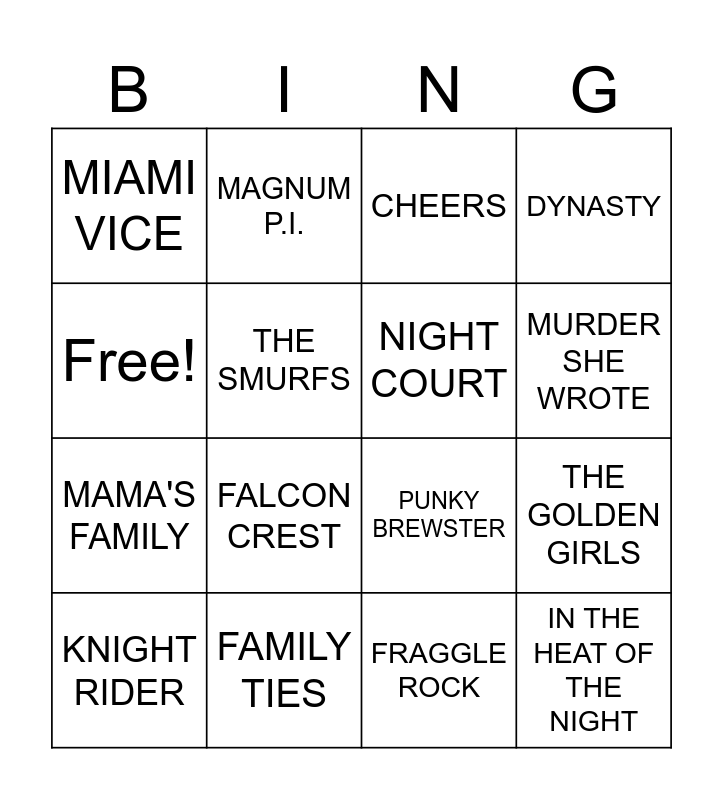 This bingo card has 16 words: FAMILY TIES, THE GOLDEN GIRLS, CHEERS, MIAMI VICE, MAMA'S FAMILY, MAGNUM P.I., PUNKY BREWSTER, FRAGGLE ROCK, Free!, THE SMURFS, KNIGHT RIDER, DYNASTY, FALCON CREST, MURDER SHE WROTE, NIGHT COURT and IN THE HEAT OF THE NIGHT.