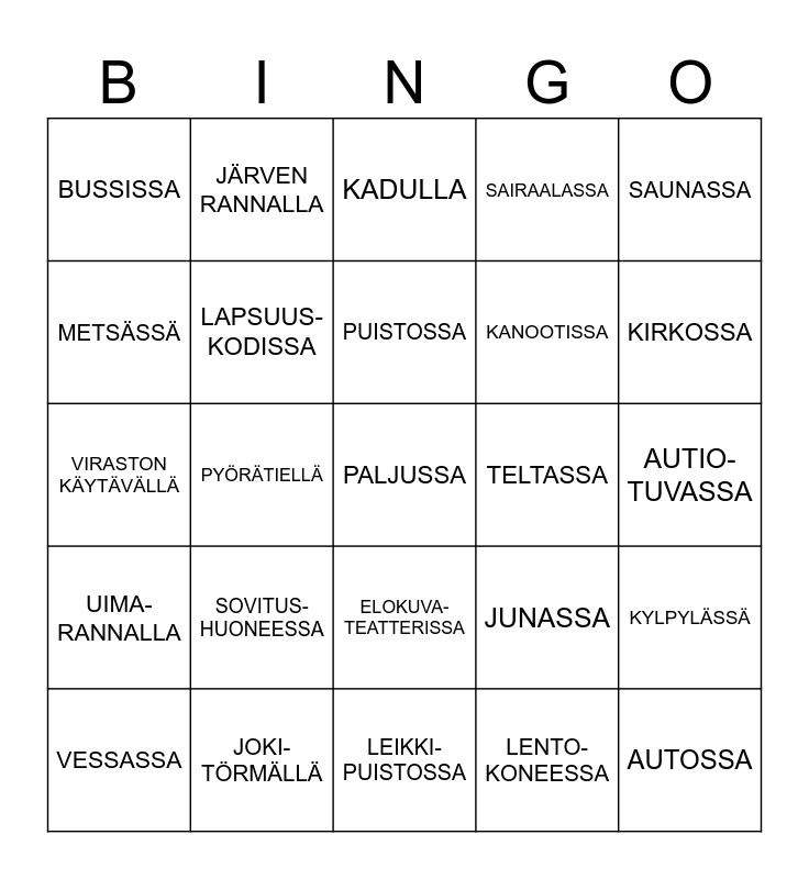 This bingo card has a free space and 24 words: SOVITUS-HUONEESSA, JOKI-TÖRMÄLLÄ, PUISTOSSA, VESSASSA, SAUNASSA, BUSSISSA, METSÄSSÄ, JÄRVEN RANNALLA, TELTASSA, ELOKUVA-TEATTERISSA, KANOOTISSA, VIRASTON KÄYTÄVÄLLÄ, JUNASSA, KYLPYLÄSSÄ, LAPSUUS-KODISSA, LENTO-KONEESSA, AUTIO-TUVASSA, KADULLA, KIRKOSSA, PYÖRÄTIELLÄ, AUTOSSA, UIMA-RANNALLA, SAIRAALASSA and LEIKKI-PUISTOSSA.