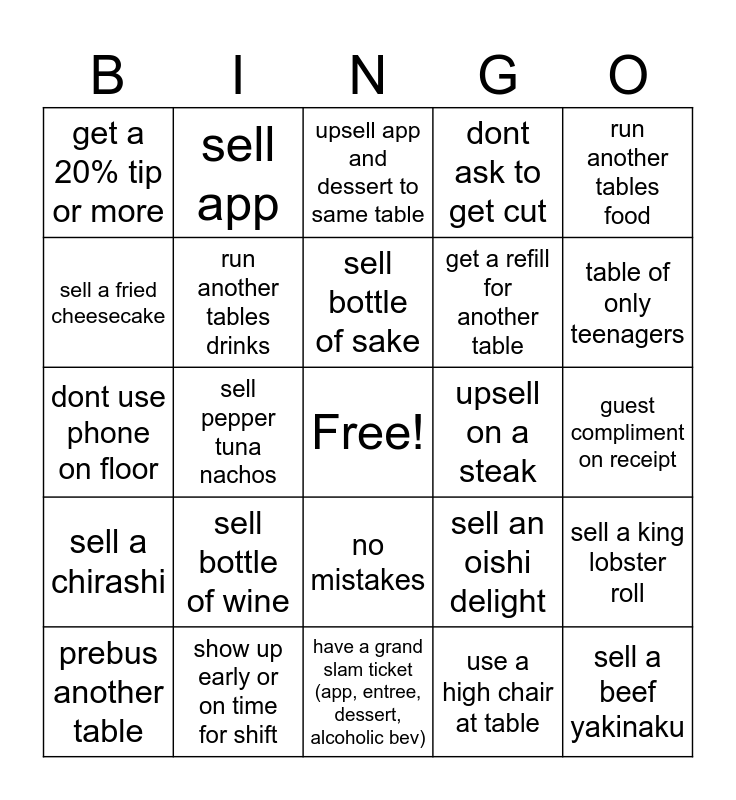 This bingo card has a free space and 24 words: sell bottle of wine, show up early or on time for shift, sell bottle of sake, prebus another table, run another tables food, get a 20% tip or more, sell a fried cheesecake, sell app, upsell on a steak, no mistakes, get a refill for another table, dont use phone on floor, sell an oishi delight, sell a king lobster roll, run another tables drinks, use a high chair at table, guest compliment on receipt, upsell app and dessert to same table, table of only teenagers, sell pepper tuna nachos, sell a beef yakinaku, sell a chirashi, dont ask to get cut and have a grand slam ticket (app, entree, dessert, alcoholic bev).