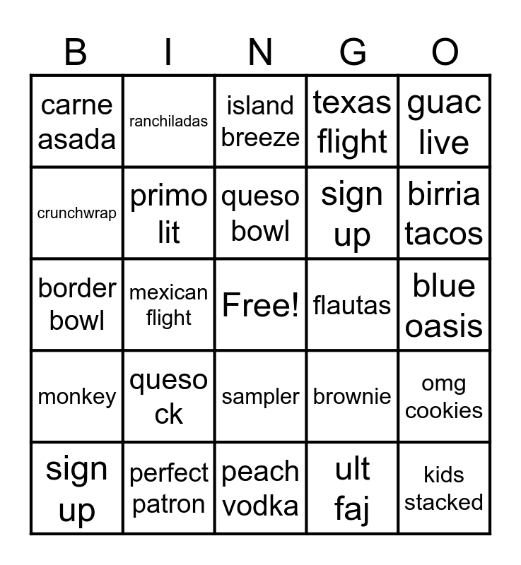 This bingo card has a free space and 24 words: sign up, queso ck, queso bowl, ult faj, guac live, carne asada, ranchiladas, island breeze, flautas, blue oasis, border bowl, primo lit, brownie, omg cookies, crunchwrap, perfect patron, peach vodka, texas flight, birria tacos, monkey, mexican flight, sampler, sign up and kids stacked.