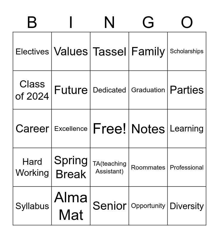This bingo card has a free space and 75 words: GPA, Diploma, Tassel, Cap, Gown, Smart, Study, Dorm Room, Babson, Exams, Grades, Alumni, Dedicated, Class of 2024, Integrity, Excellence, Collaboration, Diversity, Inclusion, Scholarships, Financial Aid, Career, Future, Values, Family, Commitment, The Quad, Determination, Babson Beavers, Leadership, Internship, Students, Professor, Roommates, Parties, Graduation, Textbook, Computer, Learning, Opportunity, Achievement, Knowledge, Lecture, Major, College, Semester, Syllabus, Electives, Gen Ed, Dining Hall, RA (Resident Advisor), TA(teaching Assistant), Admissions, Acceptance Letter, Academic Advisor, Dean, Campus, Success, Bachelor Degree, Credits, Spring Break, Tuition, Transcript, Sorority, Faternity, Notes, Quiz, Parents Weekend, Clubs, Professional, Hard Working, Alma Mat, Friends, Senior and Memories.