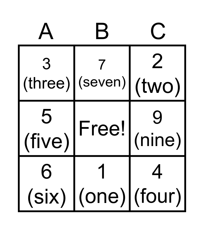 This bingo card has a free space and 10 words: 1 (one), 2 (two), 3 (three), 4 (four), 5 (five), 6 (six), 7 (seven), 8 (eight), 9 (nine) and 10 (ten).