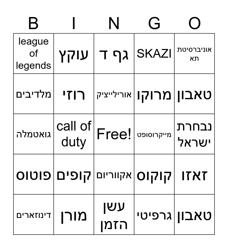 This bingo card has a free space and 29 words: דינוזארים, minecraft, call of duty, battlefield, league of legends, גף ד, רוזי, קופים, מייקרוסופט, מורן, נבחרת ישראל, טאבון, עשן הזמן, גרפיטי, טאבון, מרוקו, אקווריום, פוטוס, אוניברסיטת תא, גואטמלה, קוקוס, ג'ימיני, מרוקו, מלדיבים, SKAZI, עוקץ, זאזו, אורילייציק and ג'ינג'י.