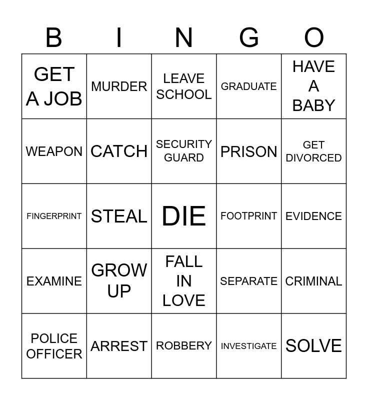 This bingo card has 30 words: ARREST, GET MARRIED, STEAL, DETECTIVE, GET A JOB, LEAVE SCHOOL, CATCH, FALL IN LOVE, FOOTPRINT, ROBBERY, EVIDENCE, DIE, INVESTIGATE, SOLVE, GET DIVORCED, BE BORN, SEPARATE, EXAMINE, GROW UP, HAVE A BABY, FINGERPRINT, MOVE IN, MURDER, PRISON, WEAPON, GRADUATE, CRIMINAL, POLICE OFFICER, SECURITY GUARD and MYSTERY.